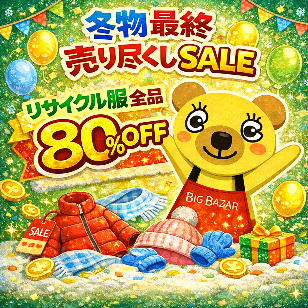 - 冬物商品を一掃!リサイクル服全品80%OFFの最終売り尽くしセール!